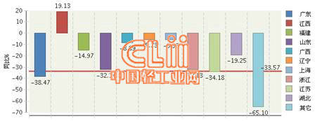 图2 2016年1~12月我国陶瓷砖累计出口额地区同比增长情况