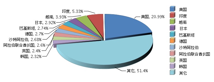 2016年1月~12月,全国玻璃制品行业完成累计出口额同比增长-1.06%。比重主要集中在美国、印度、越南、日本、巴基斯坦、德国、沙特阿拉伯、阿拉伯联合酋长国、英国、韩国、其它等地区。其中:美国累计出口额占20.99%,同比增长13.66%;印度累计出口额占5.33%,同比增长9.67%。