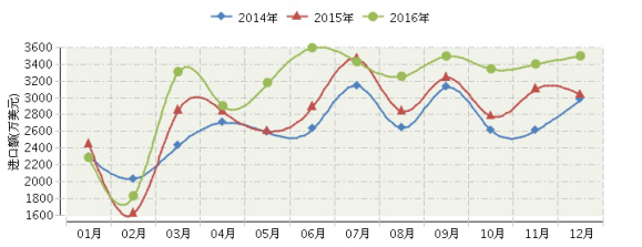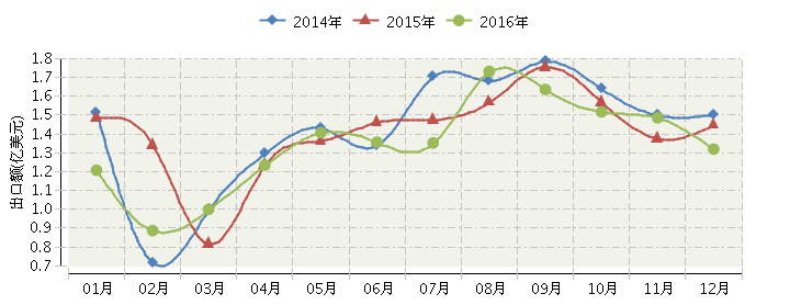 图:2014-2016年全国乐器行业连续三年月度出口额对比