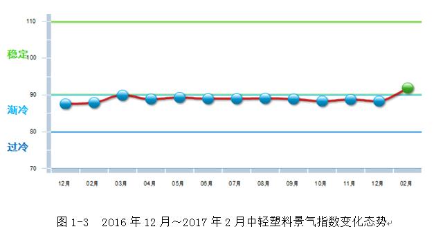 中国轻工业经济运行及预测预警系统监测显示:2017年2月份中轻塑料景气指数为91.92,比去年12月回升3.57点。塑料景气指数结束了22个月在蓝色渐冷区间的走势,重返绿色稳定区间。