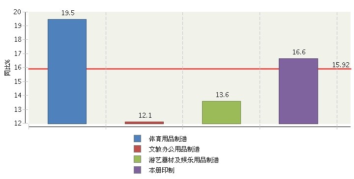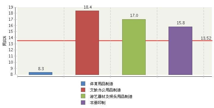 从文体用品子行业的累计主营业务收入增速来看,各子行业均实现中高速增长,其中:文教办公用品制造、游艺及娱乐用品制造、本册印制三大子行业主营收入分别实现18.4%、17%和15.8%的高速增长;体育用品制造增速相对较低,增长8.3%。