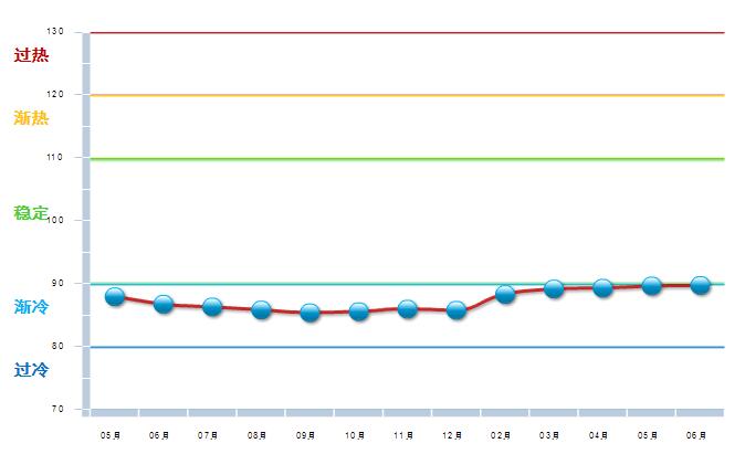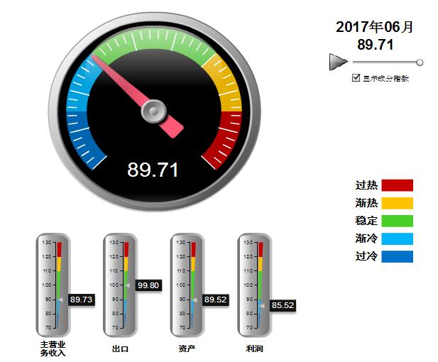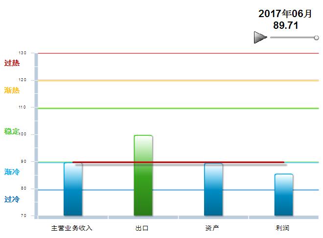 2016年5月至2017年6月,中轻皮革景气指数基本稳定,在90附近小幅波动,处于渐冷提示区运行(参见图3)。