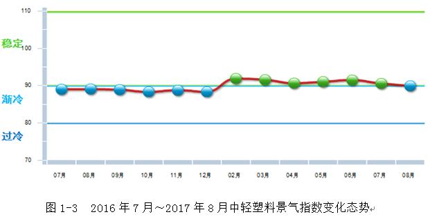 中国轻工业经济运行及预测预警系统监测显示:2017年8月份中轻塑料景气指数为89.94,比7月份回落0.65点。目前,塑料景气指数在六个月于绿色稳定区间运行后,连续两个月走低,进入蓝色渐冷区间。