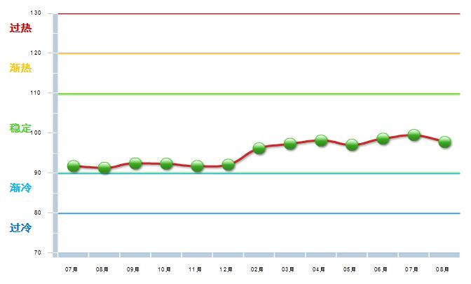 图1 2016.7—2017.8自行车行业主营业务收入景气指数变化态势