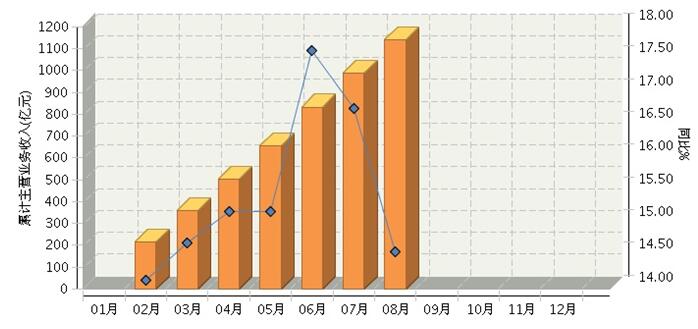 2017年1月~8月,全国自行车制造行业累计完成主营业务收入1,139.83亿元,同比增长14.57%。比7月份累计增速低2.19个百分点。(参见图2)