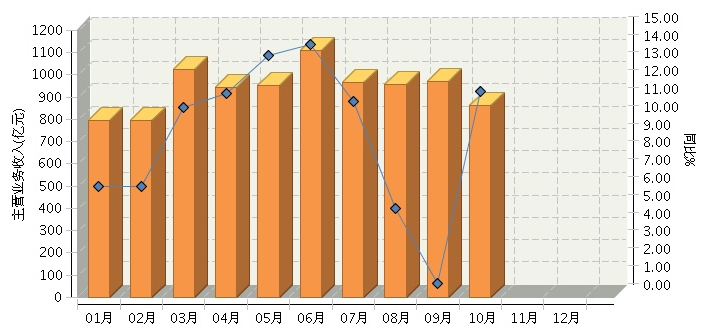2017年1月~10月,全国工美行业累计完成主营业务收入9,365.90亿元,同比增长9.04%。其中:1月份完成主营业务收入794.56亿元,同比增长6.21%;2月份完成主营业务收入794.56亿元,同比增长6.21%;3月份完成主营业务收入1024.09亿元,同比增长10.65%;4月份完成主营业务收入943.13亿元,同比增长11.48%;5月份完成主营业务收入951.53亿元,同比增长13.56%;6月份完成主营业务收入1107.75亿元,同比增长14.18%;7月份完成主营业务收入963.87亿元,同比增长11%;8月份完成主营业务收入954.71亿元,同比增长4.96%;9月份完成主营业务收入970.72亿元,同比增长0.76%;10月份完成主营业务收入860.97亿元,同比增长11.54%。