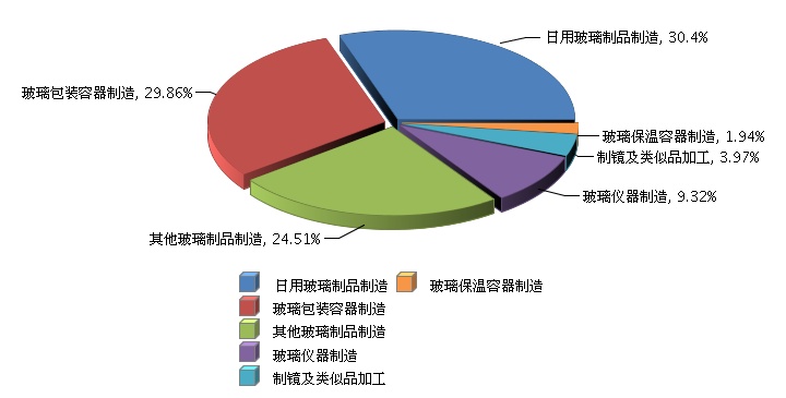 其中,日用玻璃制品制造占30.4%,同比增长12.17%;玻璃包装容器制造占29.86%,同比增长-3.47%;其他玻璃制品制造占24.51%,同比增长22.3%;玻璃仪器制造占9.32%,同比增长-3.25%;制镜及类似品加工占3.97%,同比增长3.08%;玻璃保温容器制造占1.94%,同比增长17.87%。