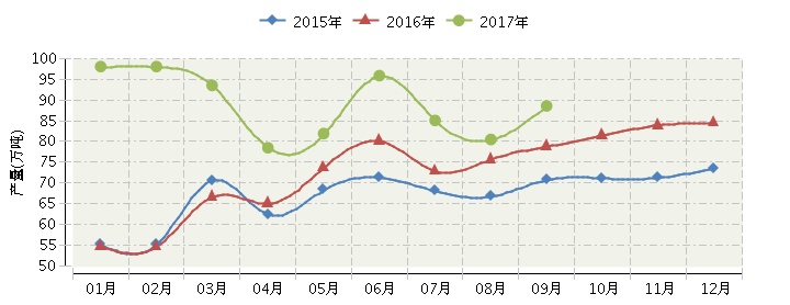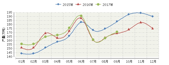 2015年-2017年前三季度玻璃包装容器产量月度走势