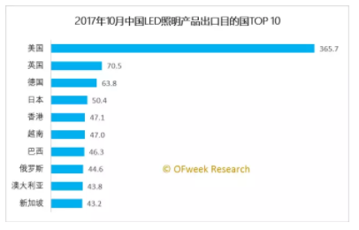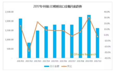 根据OFweek行业研究中心《中国LED照明出口月度报告》最新公布数据,2017年10月,中国LED照明产品出口额总共为16.26亿美元,同比增长2.8%,环比下降30.3%。出口数量6.26亿个/套,同比增长15.85%。2017年前十个月出口金额总共为178.2亿美元,同比增长7.4%,整体上处于稳定增长的态势。