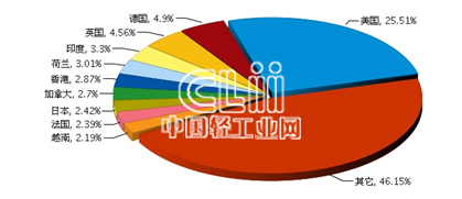 从出口省市来看,比重主要集中在广东、浙江、福建、江苏、上海等地区。其中:广东完成累计出口额167.29亿美元(占55.77%),同比增长16.68%。
