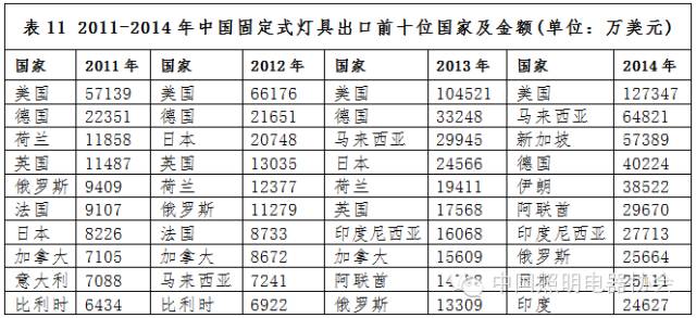 表11列出了2011-2014年税号94051000的固定式灯具出口前十位国家和地区。出口金额的大幅增长也体现了我国固定式灯具出口产品的附加值大幅提高。美国在总量上依然遥遥领先,马来西亚、新加坡、印尼等东南亚国家和阿联酋、伊朗等中东国家的增长势头明显,这也将是我国出口企业应关注的潜力市场。另值得注意的是,向日本出口固定式灯具的数量一般在十名开外,但出口额却高居前列,体现出日本市场对灯具类的需求相对高端的特点;相比较而言,俄罗斯和亚洲市场对此类产品则更看重性价比。