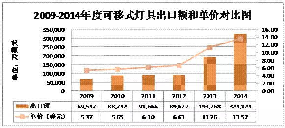 表12 中国可移式灯具出口额与单价(2009-2014年)