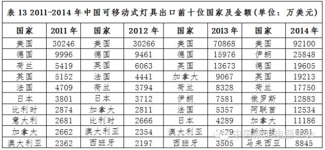 表13列出了2011-2014年税号为94052000的可移式灯具出口前十位国家和地区。可以看出,原有可移式灯具出口主要面向是发达经济体,欧美国家对台地灯的安全性、光品质和拓展功能等方面都有着高要求,出口到这些国家的利润也颇为可观;但近两年中东和东南亚市场发展势头迅猛,值得出口企业重点关注。