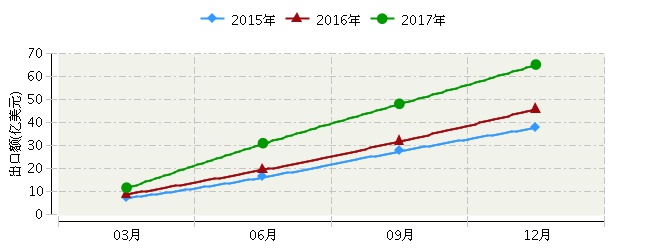 近三年来,我国玩具行业对一带一路国家出口额不断攀升。2017年全国玩具行业对一带一路累计出口额63.73亿美元,占出口总额的25.22%,同比增长41.87%,较去年增速提高20.64个百分点。玩具行业对一带一路国家累计出口额年度对比见下图: