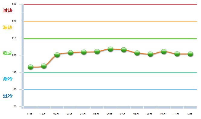 图1 2016.11—2017.12自行车行业主营业务收入景气指数变化态势