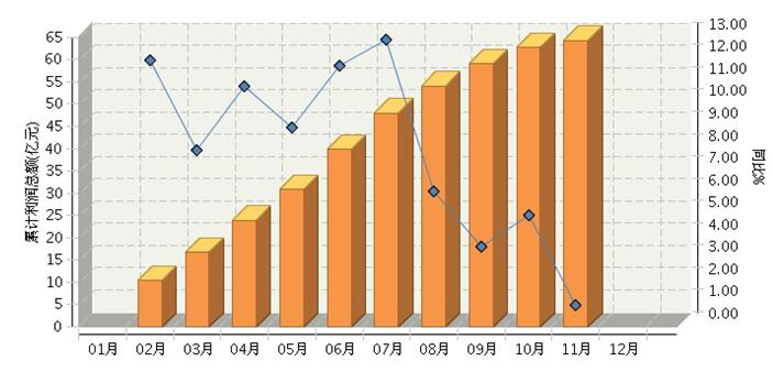 22017年1月~11月,全国自行车制造行业累计完成利润总额64.27亿元,同比增长0.96%。累计增速比上月大幅下降,下降了4个百分点。(参见图2)。