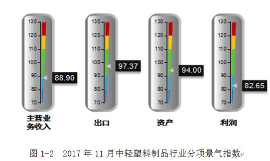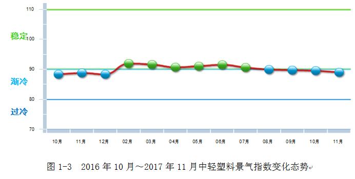 中国轻工业经济运行及预测预警系统监测显示:2017年11月份中轻塑料景气指数为88.97,比10月份回落0.55点。目前,塑料景气指数连续四个月走在蓝色渐冷区间运行。