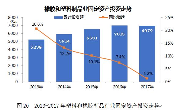 2017年橡胶和塑料制品业累计固定资产投资6979亿元,增长1.2%,增速连续四年下降,比上年回落6.2个百分点。