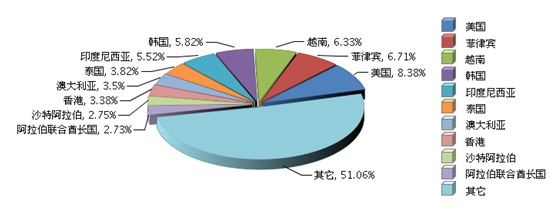 据海关数据显示,2017年1~12月我国陶瓷砖出口额排在前十位的贸易国(地区)依次是美国、菲律宾、越南、韩国、印度尼西亚、泰国、澳大利亚、香港、沙特阿拉伯、阿拉伯联合酋长国。其中出口美国3.71亿美元(占8.38%),同比下降0.67%;出口菲律宾2.97亿美元(占6.71%),同比下降11.59%;出口越南2.8亿美元(占6.33%),同比增长9.31%。