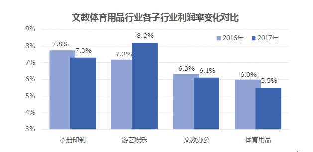 2017年,全国文教体育用品制造业主营业务收入利润率为6.36%,较去年下降0.13个百分点,低于