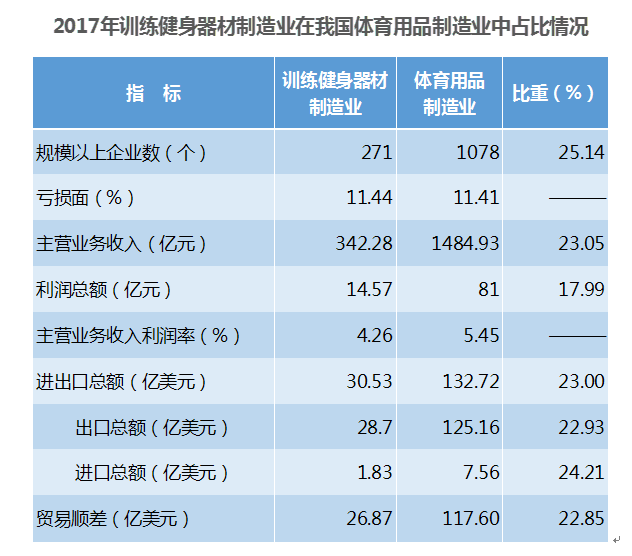 训练健身器材制造业属于我国体育用品制造业中子行业之一,但各项主要经济指标占据体育用品制造业举足轻重的位置。2017年,我国运动训练健身器材制造业规模以上企业主营业务收入占比23.05%,利润总额占比17.99%,出口总额占比22.93%,进口总额占比24.21%。