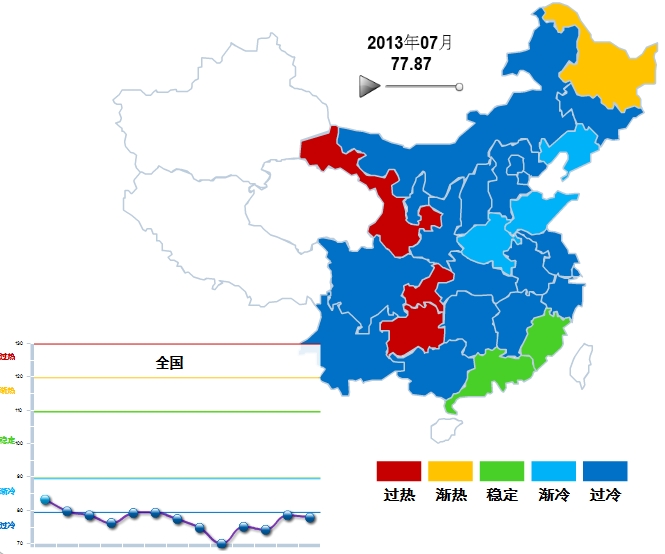 2013年7月中轻电池景气指数为77.87,继续停留在“过冷”提示区,较3月的68.56有较大提升。(参见图1)