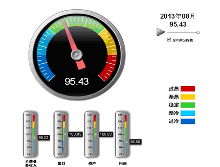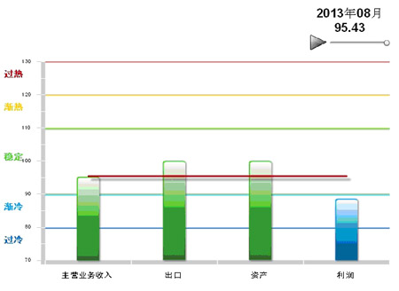2013年8月文体主营业务收入景气指数95.22;文体出口景气指数100.03;文体资产景气指数100.03;文体利润景气指数88.6(参见图2)。