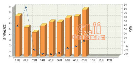 从月度出口金额情况看,1、2月份出口同比高速增长;3月份起出口陡然回落,环比下挫,月度出口额为1~9月单月最低值,同比出现年内首次负增长;二季度,月度同比增速继续下行,5月份同比下降24.78%,为年内最低值;三季度以来,月度出口额、同比增速逐月回升,9月份出口8.5亿美元,为年内单月最高值,同比增长7.5%,结束自3月份以来连续6个月的负增长。详见图1。