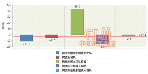 图3 2013年1~9月全国陶瓷行业累计出口额子行业同比增长情况