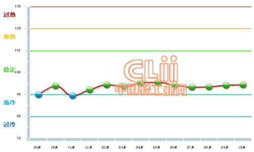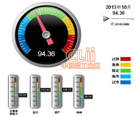 2013年10月中轻陶瓷景气指数94.36,处于稳定区间,较上月提升0.23,参见图1。
