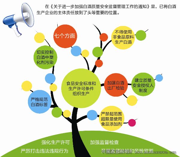 在这个“重申”的《通知》里,《华夏酒报》记者发现,已将白酒生产企业的主体责任放到了头等重要的位置,认为这是从源头保障白酒质量安全的头等大事。为此,《通知》从严格依照法律法规,食品安全标准和生产许可条件组织生产、切实控制白酒中塑化剂污染、不得使用非食品原料生产白酒、严禁超范围超限量使用食品添加剂、加强白酒出厂检验、严格规范白酒标签、建立质量安全授权人制度等七个方面加以详尽阐述,并从强化生产许可、加强监督检查、开展监督抽检和风险监测、严厉打击违法违规行为等四个措施予以落实。