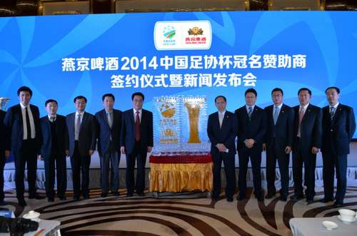 2月19日下午,燕京啤酒独家冠名2014年中国足协杯签约仪式在京举行。中国足协常务副主席兼秘书长张剑,中国足球协会副主席林晓华、燕京啤酒集团董事长李福成,中国福特宝足球产业发展公司总经理董铮,燕京啤酒集团总经理赵晓东出席签约仪式。