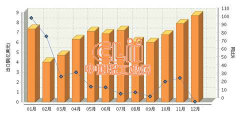 从月度出口金额情况看,1月出口涨幅巨大,同比增长103.48%,为全年单月最高增速。2月出口额环比迅速回落,出口额仅4.02亿美元,为全年单月最低值,但同比增长达80.57%,增速依然高企。3、4月出口额逐月增加,但同比增速已降至30%左右水平。5月份出口额环比增加,但月度同比增速仍行下降趋势;至9月,月度同比增速跌落至7.09%。10月份起月度出口金额逐月增加,10、11月份月度出口额同比增速恢复到25%以上。12月出口8.69亿美元,为全年单月最高,但由于上年基数高,同比仅增长0.26%。