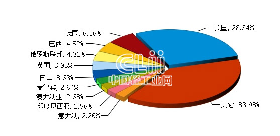 从出口贸易国看,2013年,福建照明行业累计出口额排在前三位的国家依次是美国、德国和巴西。其中:美国完成累计出口额6.24亿美元(占28.34%),同比增长6.8%;德国完成累计出口额1.36亿美元(占6.16%),同比增长29.92%;巴西完成累计出口额1亿美元(占4.52%),同比增长48.25%。