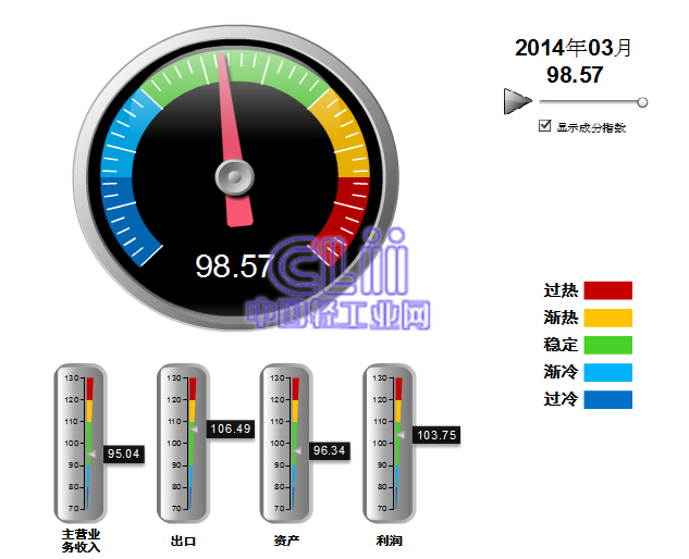 发布2014年3月中轻文教体育用品行业景气指数。3月,中轻文体景气指数为98.57,其中:主营业务收入景气指数为95.04,出口景气指数为106.49,资产景气指数为96.34,利润景气指数为103..75(图1-1)