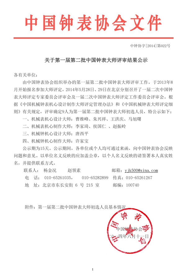 关于第一届第二批中国钟表大师评审结果公示