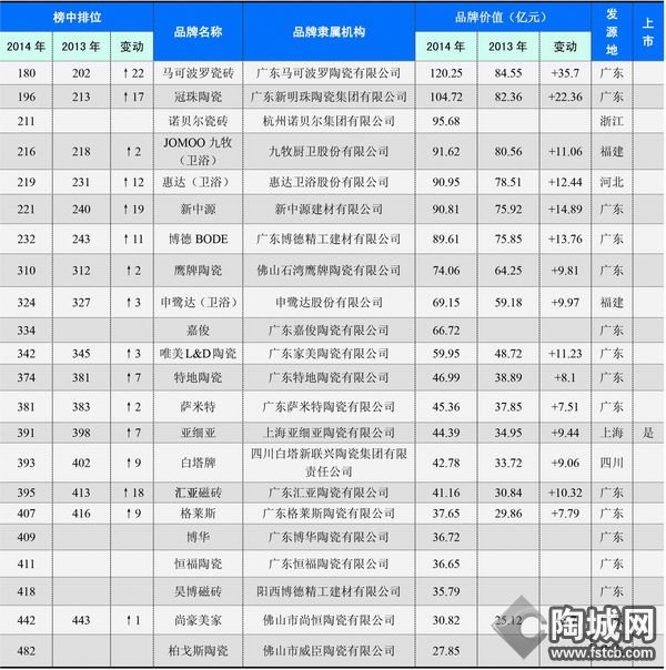 据世界品牌实验室发布的数据显示,马可波罗瓷砖以120.25亿元的品牌价值再次位列中国建陶行业榜首;JOMOO九牧则以91.62亿元的品牌价值,再次摘得中国卫浴行业品牌价值的桂冠。本届上榜数量与2013年持平,最高品牌价值提升了35.7亿元。