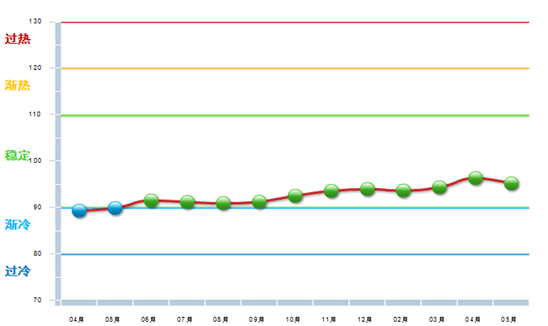 图1-2 2013年4月~2014年5月中轻文体景气指数变化态势