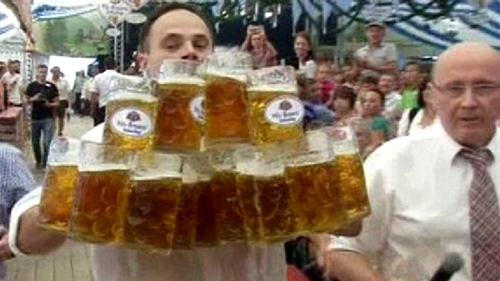 据BBC报道,德国巴伐利亚州一名服务生近日破了一项世界纪录。这位名叫奥利弗·斯特鲁安普费尔的男子端着27杯每杯1升啤酒的酒杯,总重量超过60公斤,行走了40米。他是在阿奔斯堡镇的啤酒节上破这项世界纪录的。