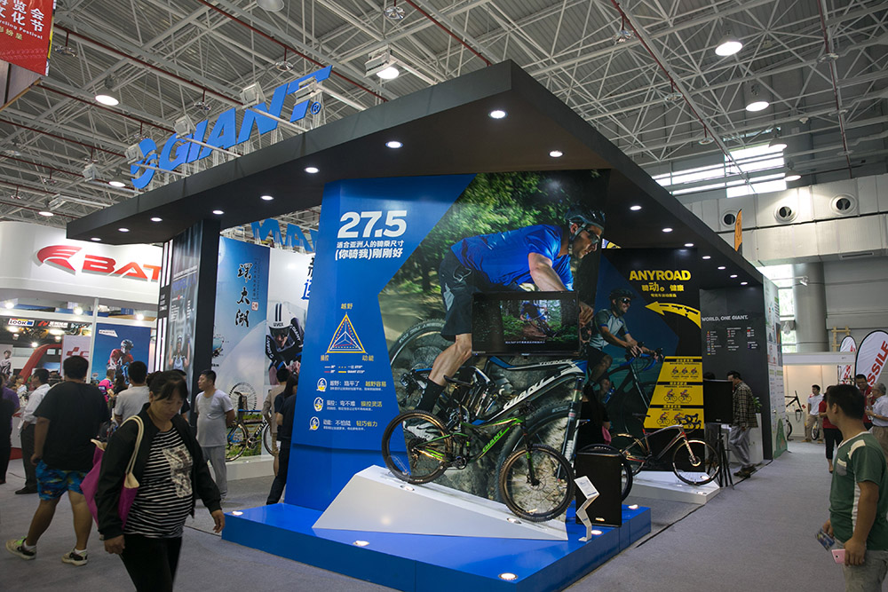 自行车大牌GIANT展台设计运动感很强,今年也开始主推27.5存车型,多款最新款的自行车在此次展会崭新亮相。
