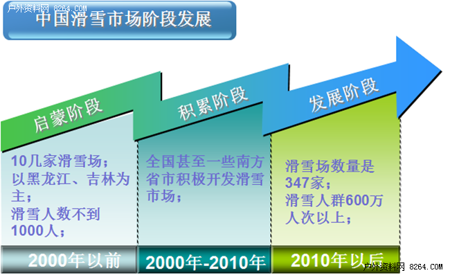 截止目前,在8264滑雪专区中记录中国滑雪场的数量是347家[点击进入],以东北黑龙江、辽宁和华北河北、北京为主向南方城市扩散;滑雪人群从最初的1000人到600万人次以上。2010年以后,户外产业飞速发展,国外品牌频频进入中国,产业规模突破100亿。