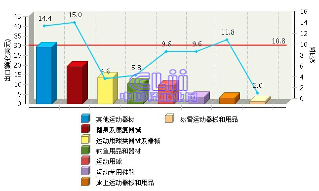 2014年1月~9月,全国体育用品及户外游乐设备行业完成累计出口额90.11亿美元,同比增长10.83%。其中,其他运动器材完成累计出口额29.22亿美元(占32.42%),同比增长14.35%;健身及康复器械完成累计出口额19.25亿美元(占21.36%),同比增长14.98%;运动用球类器材及器械完成累计出口额13.59亿美元(占15.08%),同比增长4.65%;钓鱼用品和器材完成累计出口额10.52亿美元(占11.68%),同比增长5.27%;运动用球完成累计出口额9.45亿美元(占10.49%),同比增长9.59%;运动专用鞋靴完成累计出口额3.66亿美元(占4.06%),同比增长9.6%;水上运动器械和用品完成累计出口额3.08亿美元(占3.42%),同比增长11.8%;冰雪运动器械和用品完成累计出口额1.34亿美元(占1.49%),同比增长2.04%。