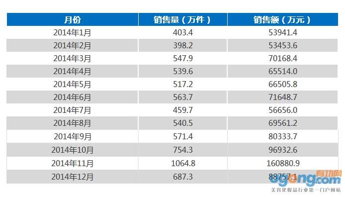 根据网络零售研究机构维恩咨询对淘宝、天猫、京东商场、易迅网、当当网、亚马逊、苏宁易购、国美电商、1号店、唯品会、聚美优品、乐蜂网等在内的16家网站的监测数据显示,2014年,护肤套装在线上共销售7048万件,销售额为934353万元,成交均价为132.57元。
