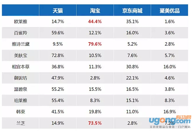 而且,非常有意思的是,在上面这张表上的标红部分,我们看到欧莱雅、雅诗兰黛、兰芝三大上榜的外资品牌,它们最大的销售额贡献平台均为淘宝。这其中,品观君不得不要提醒的是,名气太大,串货、假货的风险也加大,这也是为什么雅诗兰黛在2014年正式入驻天猫平台,开设旗舰店。