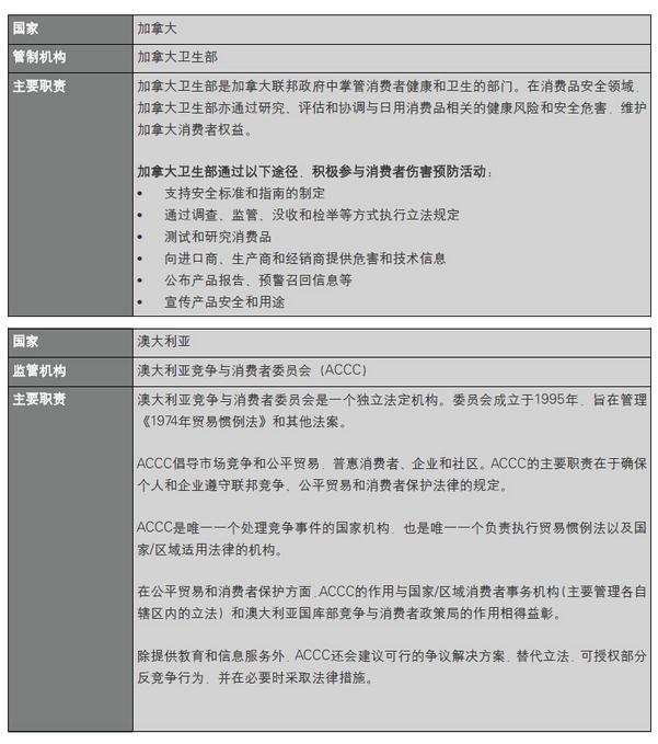 美国、欧盟、加拿大和澳大利亚的管制机构包括美国消费品安全委员会(CPSC)、欧盟委员会、欧洲议会和欧洲理事会、加拿大卫生部和澳大利亚竞争与消费者委员会(ACCC)。这些管制机构负责制定关于消费者产品(包括玩具和儿童产品,如儿童护理用品和儿童珠宝)方面的法规规定。