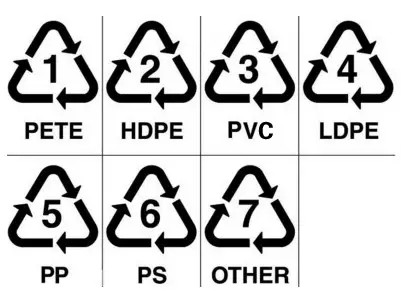 每个塑料容器上都有一个三角形标识,里边有7个数字编号,每个编号代表一种塑料原料的种类,就像是塑料制品的“身份证”,主要用于塑料制品回收时分类用,是由美国塑料行业相关机构制定。3个箭头组成的三角形的意思是塑料容器是可回收再生利用的,并不意味着塑料容器可以重复使用,也不代表塑料容器的安全级别