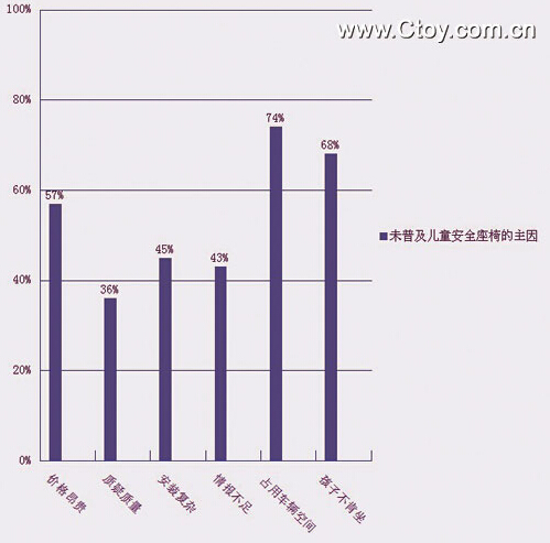 据报道,《宝贝市场》杂志和SinMedia调研部门联手对100名居住于上海、北京两个一线城市的有车有孩家庭;以及100名居住于长沙、广州、西安三个省会城市的有车有0~6岁孩家庭做了关于“儿童安全椅使用状况”以及“未普及使用的原因”等方面的调查。除了陶舒提到的安全意识缺乏、认为安全座椅价格昂贵是主因外,安装复杂、孩子不肯坐、占用车内空间等也包括当中。