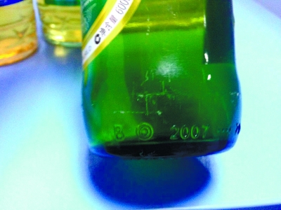 长沙市质监局相关人士说,识别超期“服役”啤酒瓶的方法其实很简单,只要看啤酒瓶瓶底上侧印的字样就可以了。如“B2007”字样,表示该啤酒瓶的生产日期为2007年。
