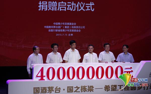“国酒茅台·国之栋梁——2015希望工程圆梦行动”捐赠启动仪式7月15日在北京清华大学蒙民伟音乐厅举行。共青团中央书记处第一书记秦宜智,共青团中央书记处常务书记贺军科,贵州省人民政府副省长陈鸣明,贵州省政协副主席、茅台集团党委书记陈敏,茅台集团董事长袁仁国,茅台集团总经理刘自力,中国青少年发展基金会副理事长兼秘书长涂猛出席捐赠启动仪式。