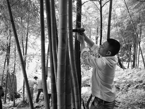 7月15日,天台红石梁济公家酒坊的技术人员来到外湖村的竹园,技术人员在当年生的嫩竹节上开口子,并灌入45度的白酒。